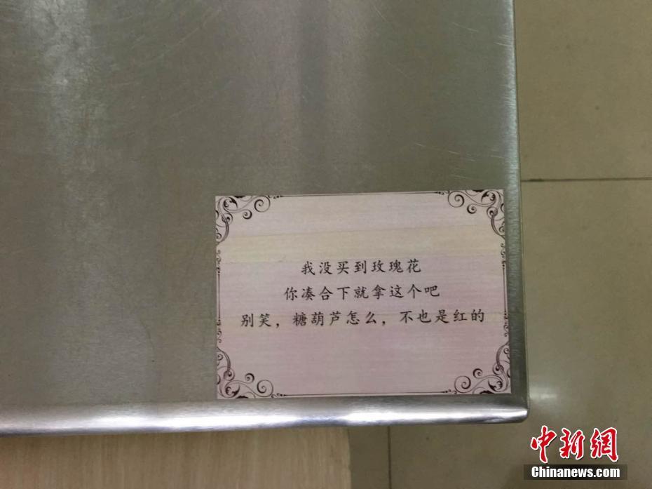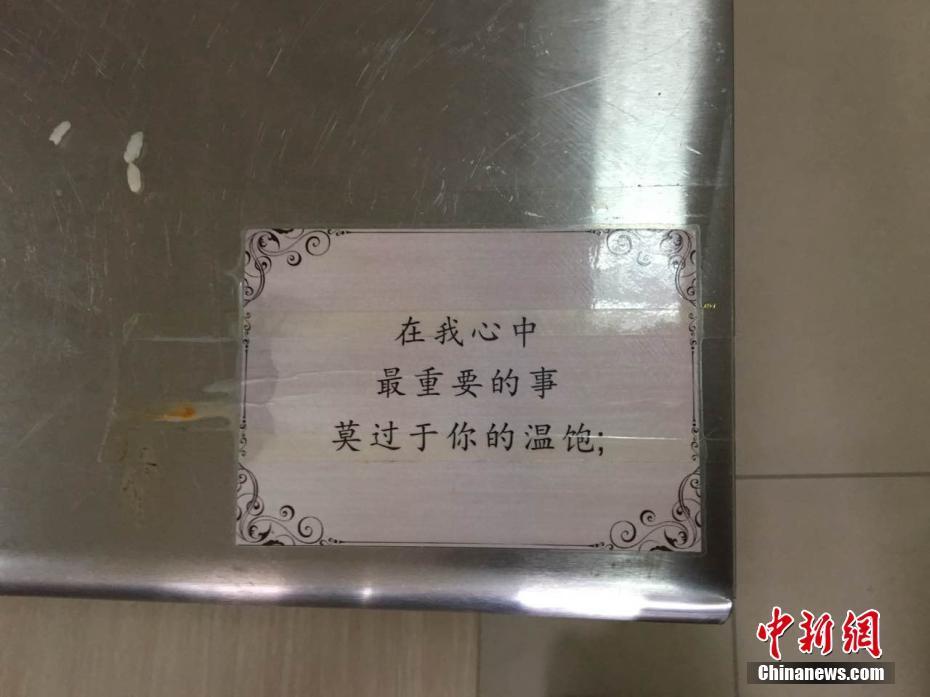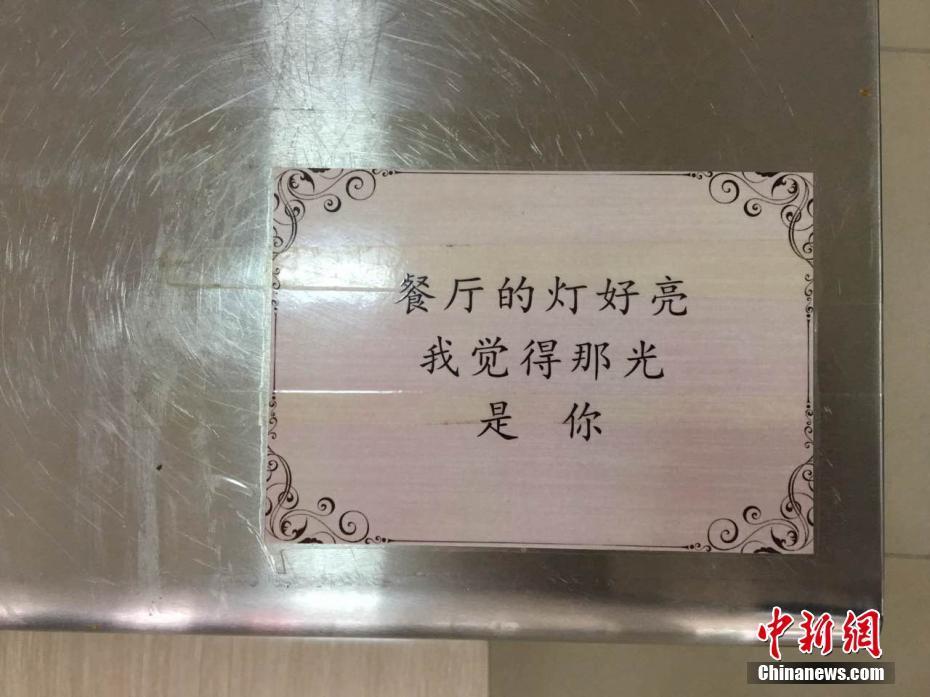 “這些情詩是開學(xué)前貼上的,剛開始只是想讓餐廳更個性化一點。”德寶朕說,很多人覺得食堂就是個做大鍋菜的地方,吃飽肚子就行。“我想加一點不一樣的元素,就發(fā)動朋友收集和吃飯有關(guān)的三行情書。”燕武 阿琳娜 攝影報道