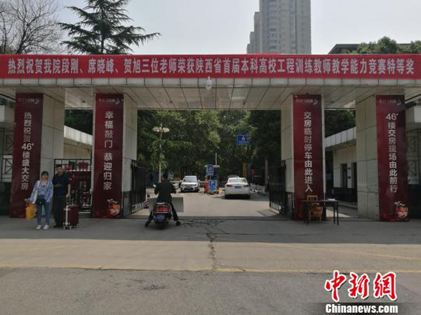校園內貼有收房指示路標。記者4月27日在西安建筑科技大學華清學院看到,華清學府城與該校緊鄰,中間有一道門可以進出。樓盤交房廣告標語張貼于學校大門的門柱上,寫有“交房臨時停車由此進入”、“46#樓交房現場由此前行”、“熱烈祝賀46#樓盛大交房”等標示。
