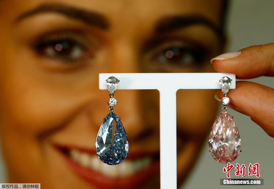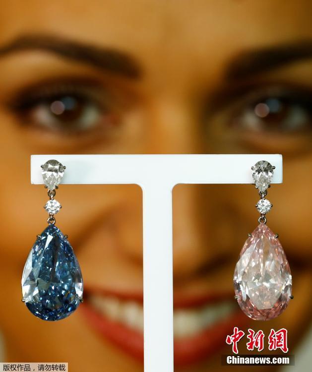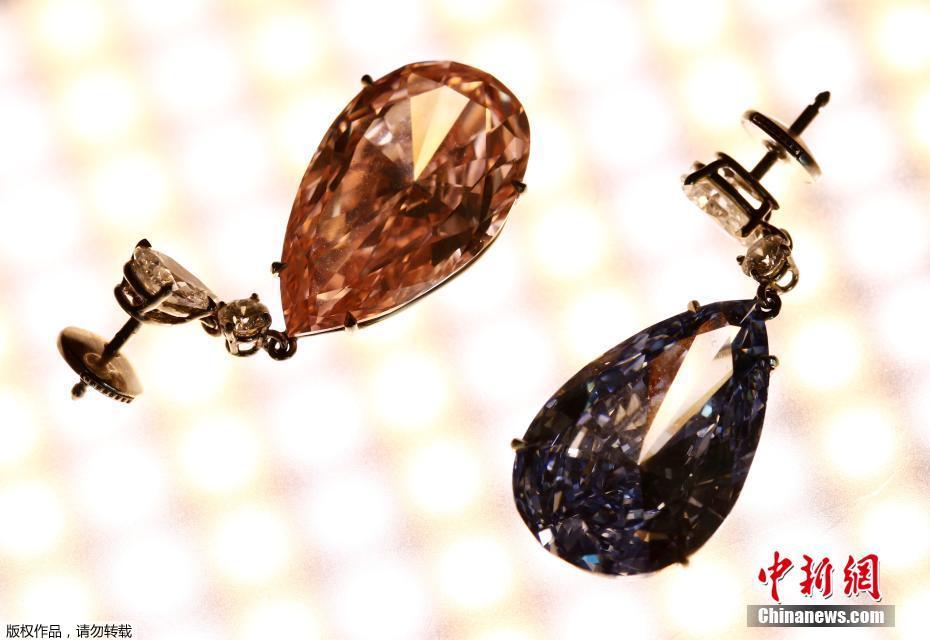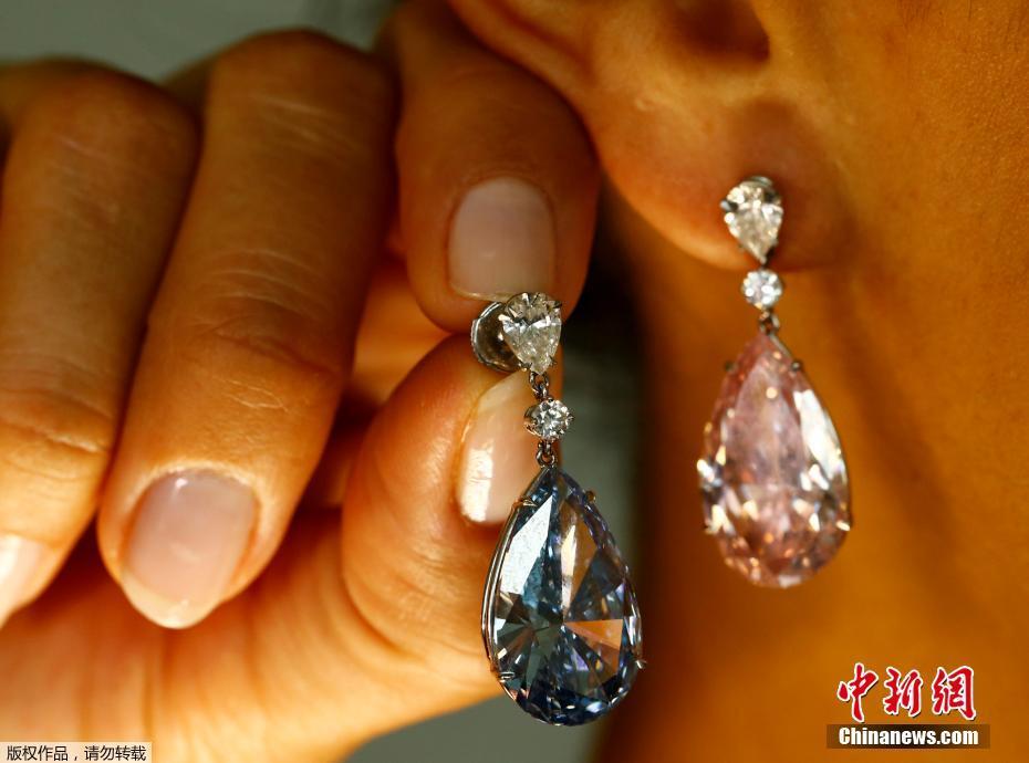 當地時間2017年5月11日,瑞士日內瓦,14.54克拉的“阿波羅藍”和16克拉的“阿耳特彌斯粉”鉆石耳環即將在蘇富比拍賣行拍賣,估價分別為3800-5000萬美元和1250-1800萬美元。