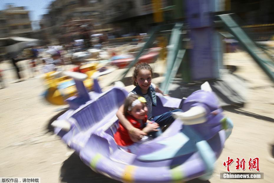 當地時間2017年6月26日,敘利亞反對派控制區杜馬,兒童在臨時的游樂園玩玩耍慶祝開齋節。
