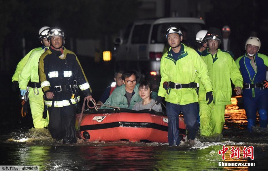 “南瑪都”預(yù)計(jì)掠過日本東部地區(qū),首都東京周邊地區(qū)將受災(zāi),地方當(dāng)局呼吁逾2萬人疏散。圖為福岡縣朝倉地區(qū)的消防人員出動(dòng),解救被洪水圍困的居民。