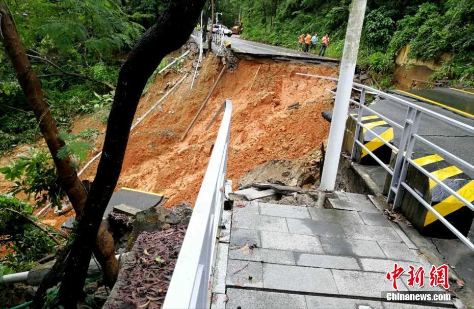 7月18日,深圳普降大暴雨局部特大暴雨,致部分路段嚴重積水、山體滑坡道路中斷、交通擁堵等險情。深圳鹽田區盤山公路恩上路段出現滑坡,無人員、車輛被困;深鹽二通道下沙頭角出口匝道中間因山水傾瀉,道路中斷,交警已經實施了交通管制。當地氣象部門先后發布了雷電、暴雨黃色、暴雨橙色和暴雨紅色分區預警信號。圖為深圳鹽田區盤山公路恩上路段出現滑坡道路中斷。中新社記者 鐘新 攝