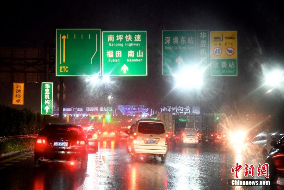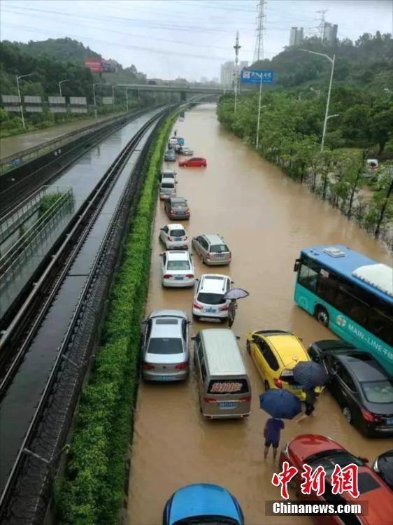 7月18日,深圳普降大暴雨局部特大暴雨,致部分路段嚴重積水、山體滑坡道路中斷、交通擁堵等險情。深圳鹽田區盤山公路恩上路段出現滑坡,無人員、車輛被困;深鹽二通道下沙頭角出口匝道中間因山水傾瀉,道路中斷,交警已經實施了交通管制。當地氣象部門先后發布了雷電、暴雨黃色、暴雨橙色和暴雨紅色分區預警信號。圖為深圳南坪快速路段車輛行駛緩慢。中新社記者 陳文 攝