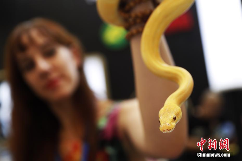 8月24日,蜥蜴、蛇、蜘蛛、土撥鼠等新派爬寵齊聚上海寵物展,吸引時尚男女前來觀賞。據了解,爬蟲類近年正逐漸取代傳統意義上的寵物,成為年輕人彰顯個性的新寵。圖為一美女訓蛇師展示盤在手臂上的黃金蟒蛇。 中新社記者 張亨偉 攝