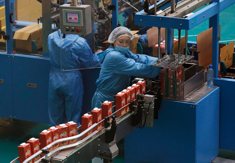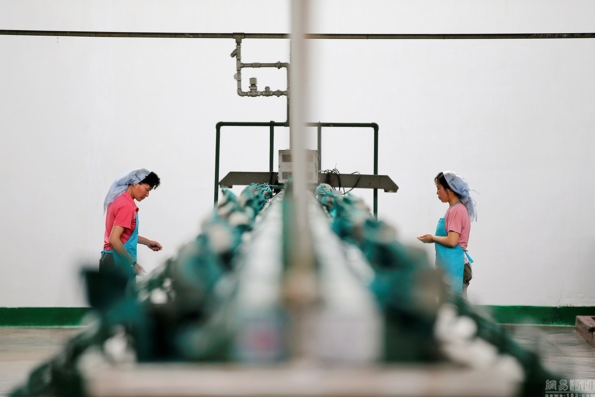 工人在一家工廠的果汁生產線進行操作,這附近的Daedonggang水果農場坐落在平壤郊區,擁有125公頃的蘋果樹。