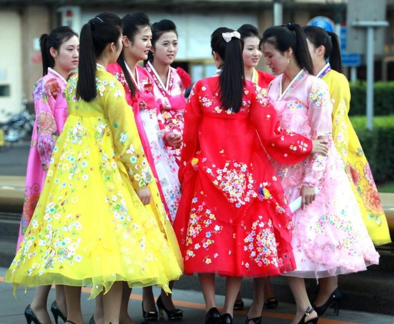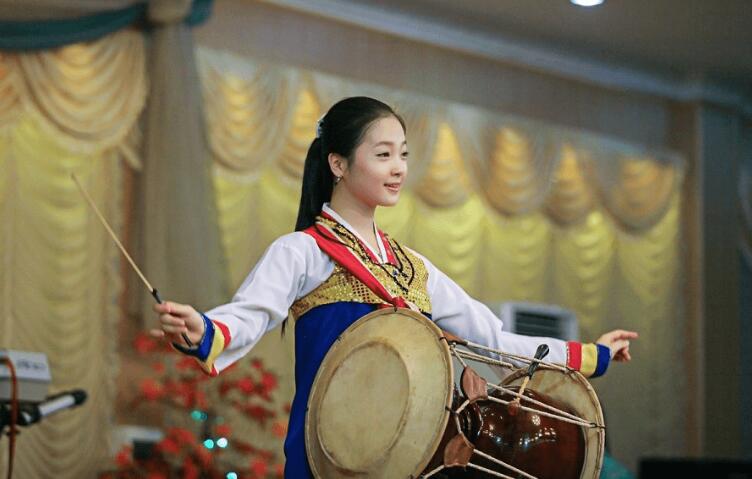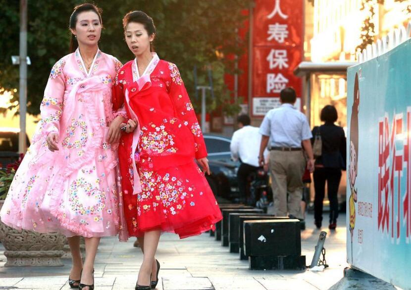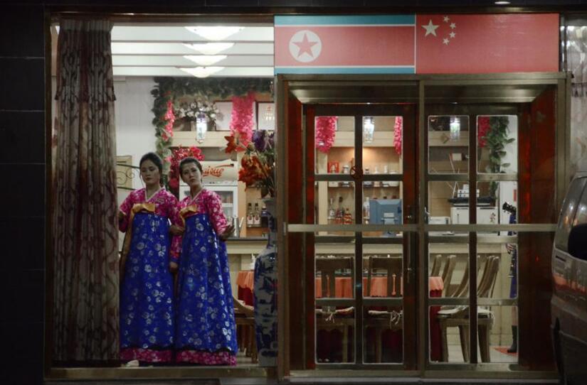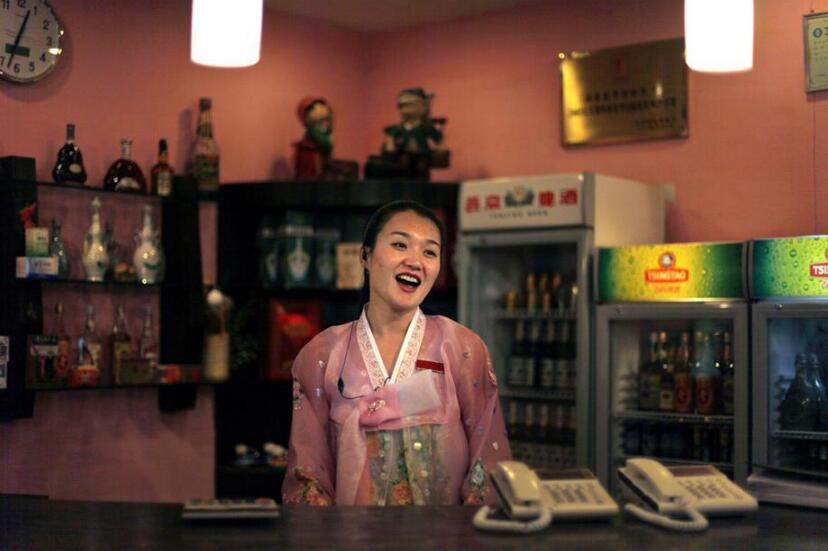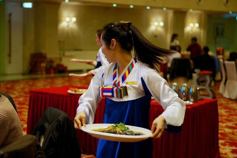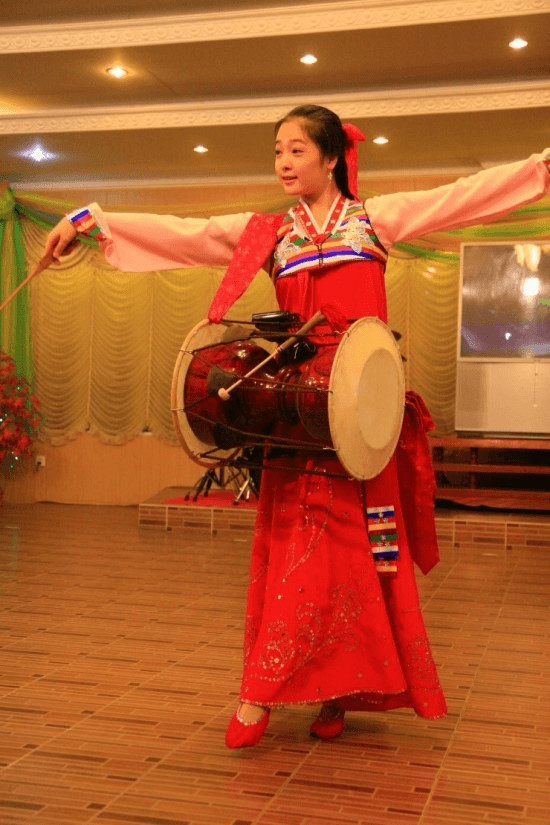 朝鮮餐廳的服務員在表演歌舞。