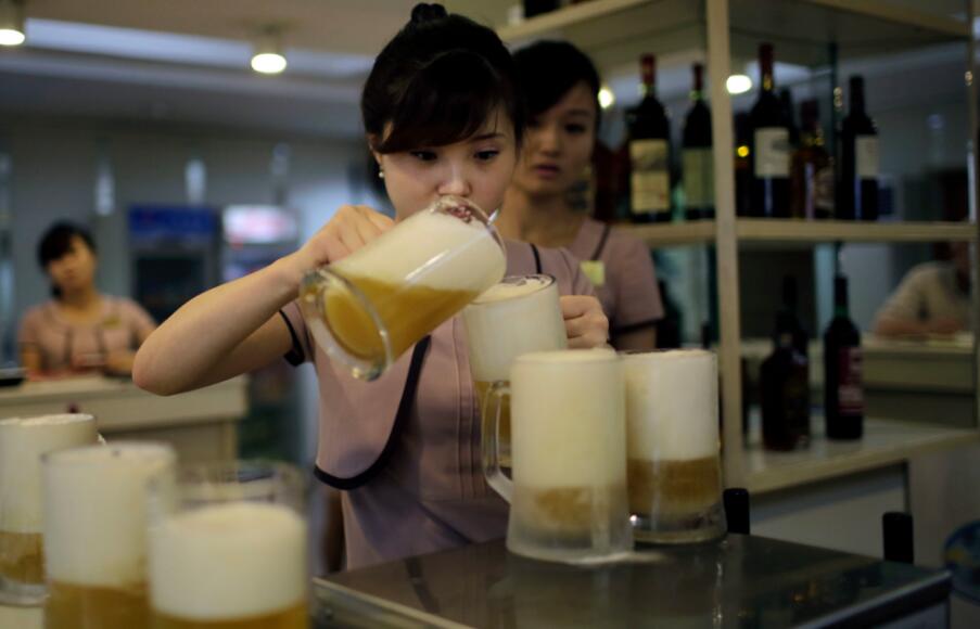 朝鮮服務員在為客人倒啤酒。