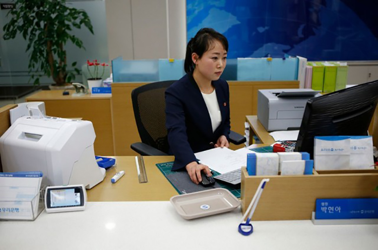 在開城工業園區內銀行工作的朝鮮員工。