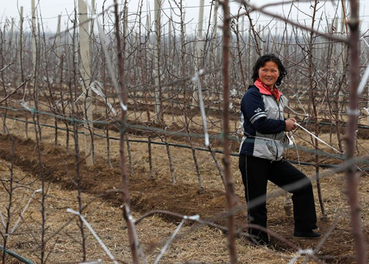 一位女工面帶微笑地站在她工作的Daedonggang水果農場。