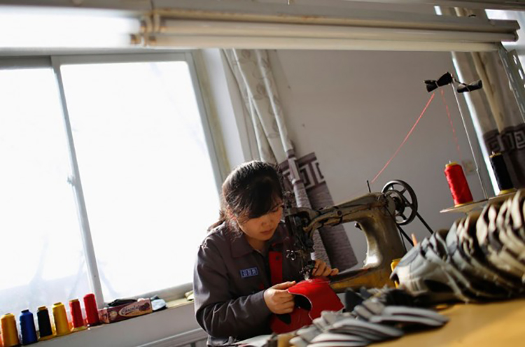 在丹東郊區的一個臨時工廠里,一位朝鮮女工正在做足球鞋。