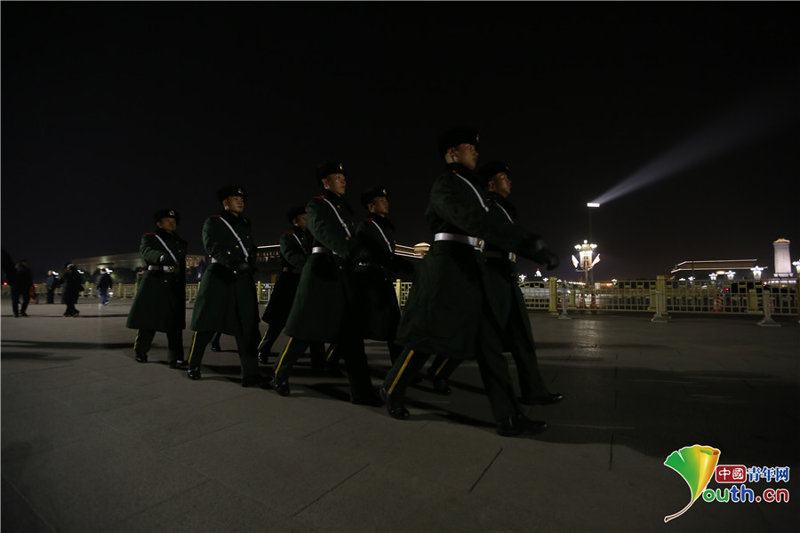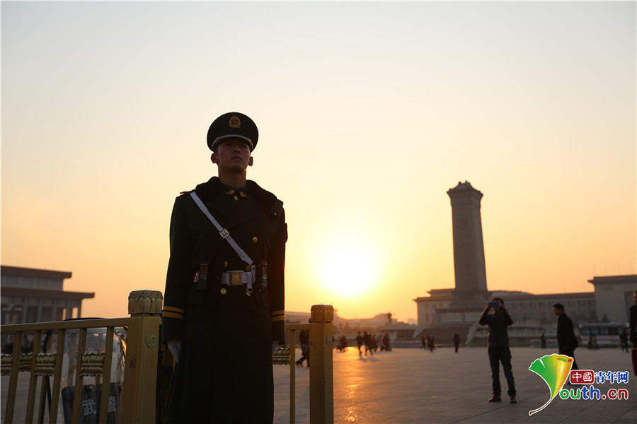 寒風刺骨,吹不垮他們堅毅的身軀;荊棘坎坷打不敗他們愛國的熱情。守護天安門是他們的責任,保衛國家是他們的擔當……