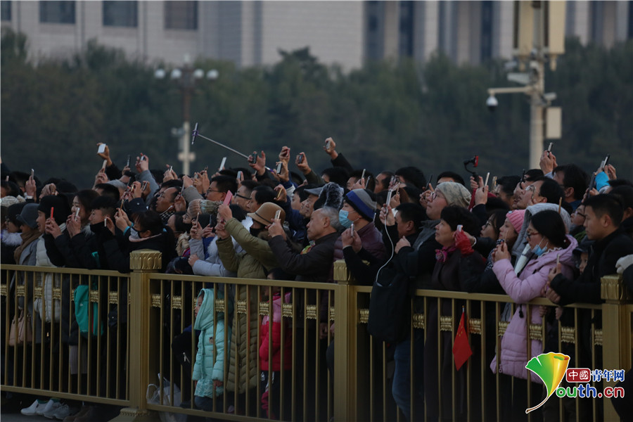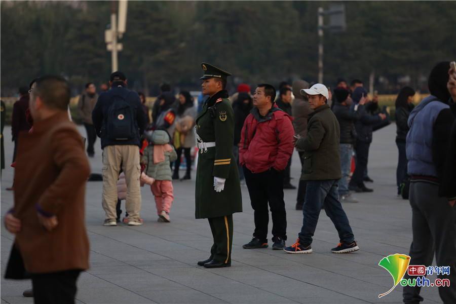 寒風中,觀看降旗儀式的游客們。中國青年網通訊員 李超 攝