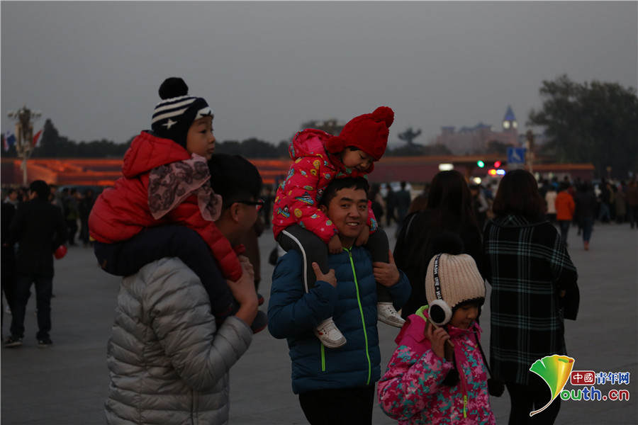 騎在家長頭頂上觀看降旗儀式的孩子們。中國青年網通訊員 李超 攝