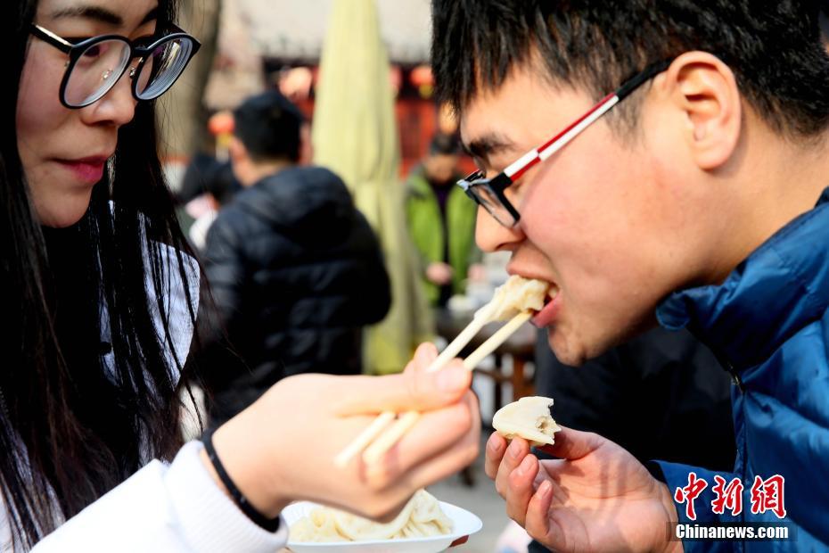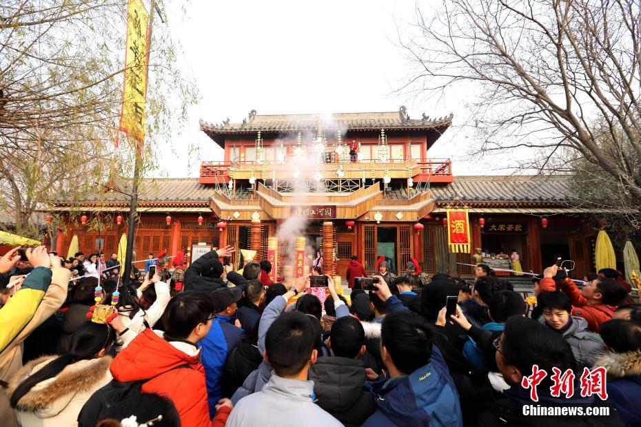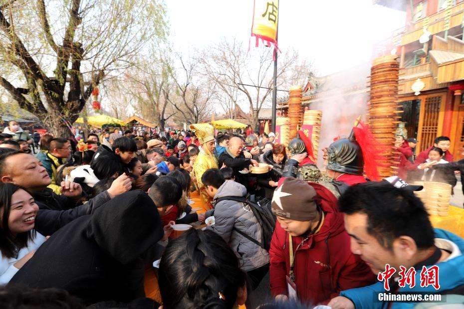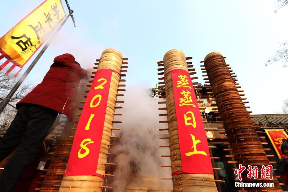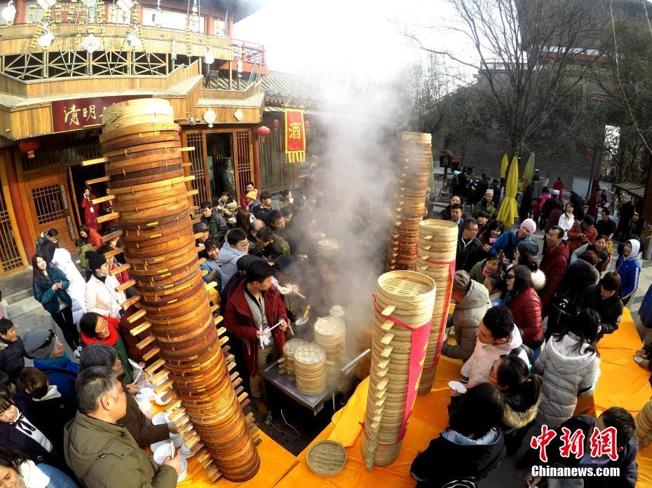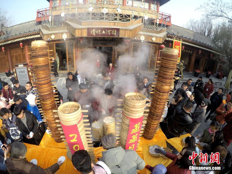 2018年1月1日,河南開封清明上河園孫羊正店門前,現場高高疊起的小籠包熱氣騰騰,小籠包上喜慶的紅字寫著“2018”“蒸蒸日上”。“宋徽宗”帶領“后宮佳麗”為游客免費發放剛剛蒸好的小籠包,寓意新的一年“蒸蒸日上”,吸引數千名游客爭相品嘗求好運。據清明上河園市場部石經理介紹,為了給游客送上這份新年祝福,清明上河園啟用了多個地方一起蒸小籠包,當天共準備了2018籠開封名吃“灌湯包”,在多個發放點陸續為民眾送上新年的“免費午餐”,祝愿大家都能夠在新的一年里“蒸蒸日上”。中新社記者 王中舉 攝