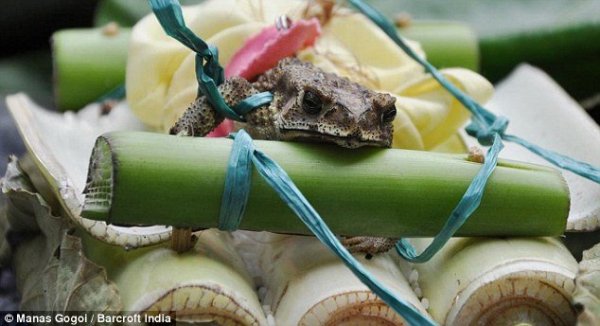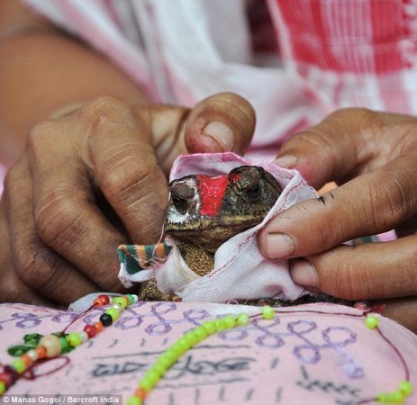 據報道,蘭詹達斯是其中一個參加了婚禮的干部,他說:“我們的地區今年并沒有看到太多的雨,因此我們安排了兩只青蛙的婚禮來取悅雨神。”儀式由抓住來自不同村莊的一雌一雄兩只青蛙開始。達斯說:“我們必須確保青蛙來自兩個不同的村莊,只有這樣,雨神才能接受我們的呼吁。等到青蛙準備就緒了,整個婚禮的儀式就像我們人類自己的婚禮儀式一樣。”