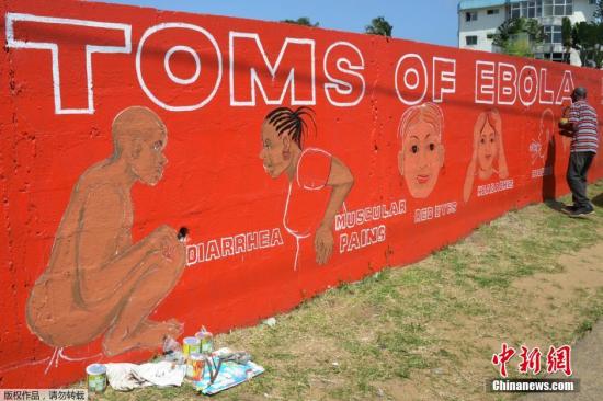 當地時間9月8日,在利比里亞,蒙羅維亞街頭,一名叫斯蒂芬·多伊的藝術家在墻上創作壁畫向人們介紹致命的埃博拉病毒病發癥狀。世界衛生組織8日發出警告,利比里亞已經成為西非受埃博拉疫情肆虐最嚴重的國家,該國因疫情死亡的人數已經占整個西非發病死亡人數的一半以上。