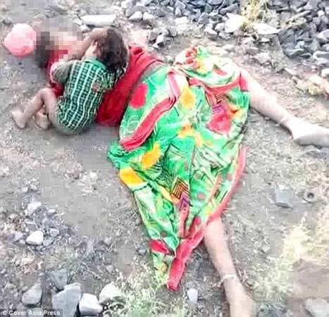 2017年5月25日報道,印度中央邦,當地警察接到報警稱,在鐵軌附近發現一具尸體。當警察趕到現場時發現,一名17個月大的嬰兒趴在母親身上一邊痛哭,一邊正在試圖喝奶。