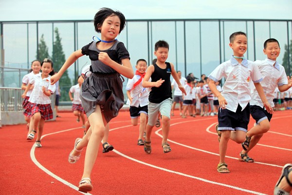 2014年9月1日,浙江省臺州市,天臺縣赤城街道第二小學的房頂環(huán)形跑道正式啟用,學生們首次在環(huán)形跑道上跑步玩耍。據(jù)了解,天臺縣赤城街道第二小學由于學校建設用地不足,該校在教學樓四樓頂設計了200米環(huán)形跑道,這一做法在全國尚屬首例。孫金標/CFP