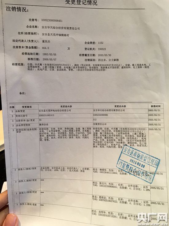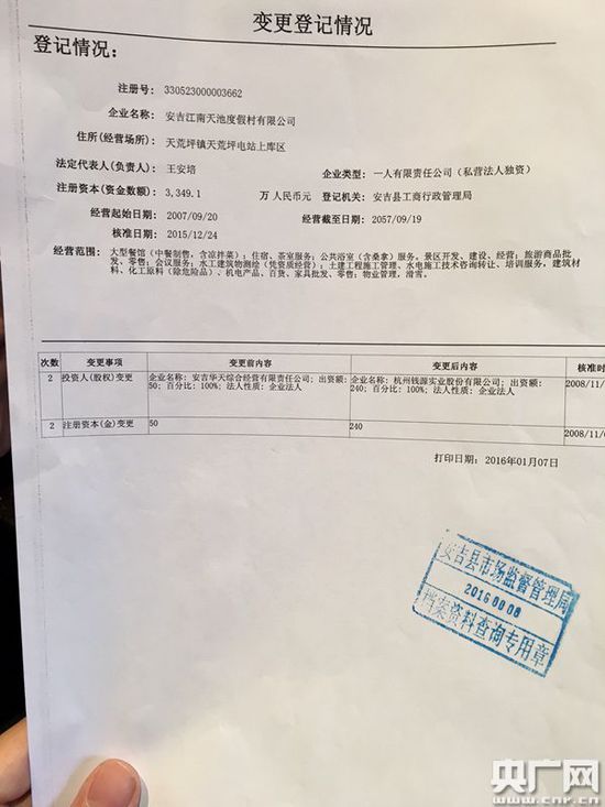 記者查詢(xún)安吉縣工商局登記信息發(fā)現(xiàn),江南天池度假村的前身就是天荒坪電站的三產(chǎn),天荒坪電站綜合經(jīng)營(yíng)公司,在2005年前屬于集體企業(yè),之后這家企業(yè)多次變身,成為了浙江錢(qián)源旅游開(kāi)發(fā)股份有限公司,江南天池公司就是錢(qián)源的全資子公司,2010年后,兩家企業(yè)的法人代表變?yōu)殡娬厩肮?huì)主席王安培。