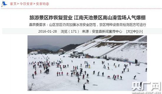 雖然安吉縣委宣傳部副部長(zhǎng)祝青稱(chēng)滑雪場(chǎng)營(yíng)業(yè)馬上就結(jié)束了,但根據(jù)安吉縣政府官方網(wǎng)站報(bào)道,1月28號(hào),江南天池滑雪場(chǎng)恢復(fù)營(yíng)業(yè),人氣爆棚。