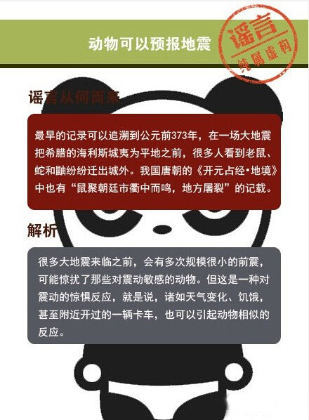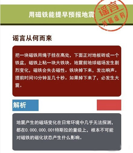 動(dòng)物、磁鐵可以預(yù)報(bào)地震、地震生命金三角可救命、土豆促進(jìn)身體康復(fù)、淋涼水可以復(fù)活假死人……這些曾經(jīng)轉(zhuǎn)發(fā)過(guò)萬(wàn)的“常識(shí)”都是謠言!