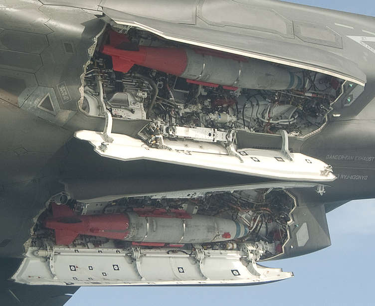 3月2日,美國洛-馬公司生產的F-35B BF-03試驗機加掛兩枚JDAM制導炸彈升空試飛。試飛過程中,F-35B開啟隱藏式彈艙玩起橫滾機動。圖為-35B BF-03隱藏式彈艙細節。