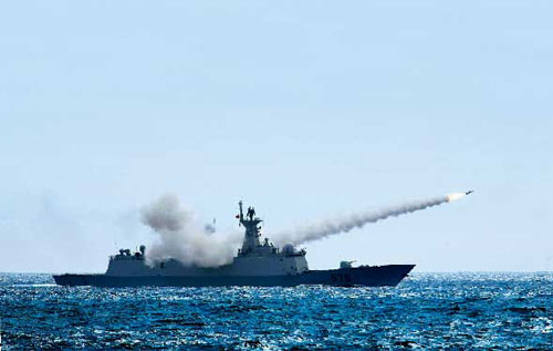 “紅方”護衛艦發射艦艦導彈(解放軍畫報圖片)