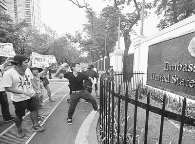 4月16日,在菲律賓首都馬尼拉,抗議菲美聯合軍演的示威者向美國駐菲大使館外墻投擲顏料。新華社發