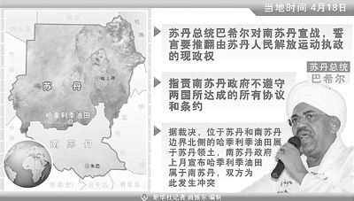 今年3月,雙邊談判取得進展,草簽了關于邊境劃界和國民地位兩份協(xié)議,并商定在4月初舉行兩國領導人會晤,當時有報道樂觀地認為,“兩國糾紛將在兩個月內得到徹底解決”。然而,南蘇丹總統(tǒng)基爾3月26日突然宣布,哈季利季屬于南蘇丹,蘇丹侵略了該國領土,南蘇丹要予以反擊。隨后,兩國陳兵哈季利季,并時有交火,直到4月11日,南蘇丹軍隊攻占了這一地區(qū)。