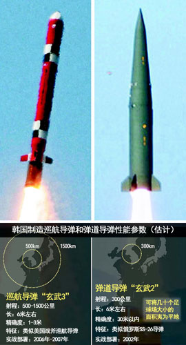 據韓國《朝鮮日報》20日報道,韓國19日首次對外公開了自制巡航導彈和彈道導彈。巡航導彈“玄武-3”最大射程1500公里,可精確打擊朝鮮全境核與導彈基地等主要戰略設施;彈道導彈“玄武-2”射程300公里,一發可將幾十個足球場大的面積夷為平地。