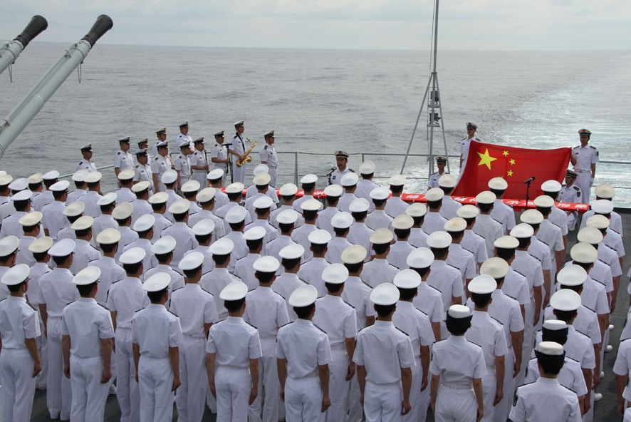 蔚藍的天空、湛藍的大海,當金色的陽光鋪滿艦體,軍樂隊奏響雄壯的中華人民共和國國歌,在后甲板整齊列隊的“鄭和”艦官兵代表舉起右手,面向國旗莊嚴宣誓,表達他們對人民海軍的忠誠和熱愛。