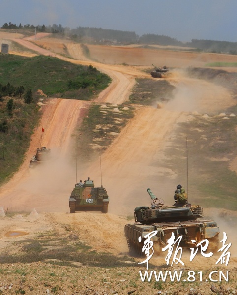 南京軍區某部把部隊拉到野外生疏地域展開實兵檢驗性演習,錘煉復雜電磁環境下部隊遠程機動、指揮控制、偵察預警和火力打擊能力。圖為4月下旬,該部坦克梯隊向演習地域開進。(龐祥川)