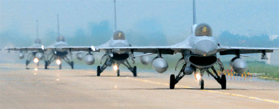 圖為韓國空軍KF-16戰(zhàn)斗機(jī)降落在第一戰(zhàn)斗飛行團(tuán)跑道上,正前往停機(jī)場。