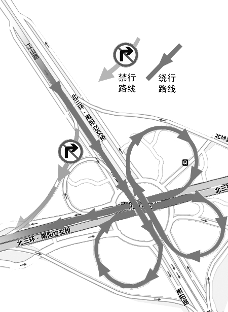鄭州交巡警支隊有關負責人建議司機在北環立交橋上通過連續轉彎實施右轉(可參照圖示),具體如下: