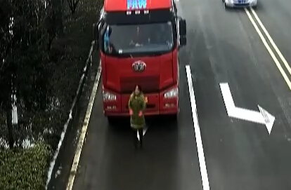 遮號牌出奇招 女子擋著貨車跑