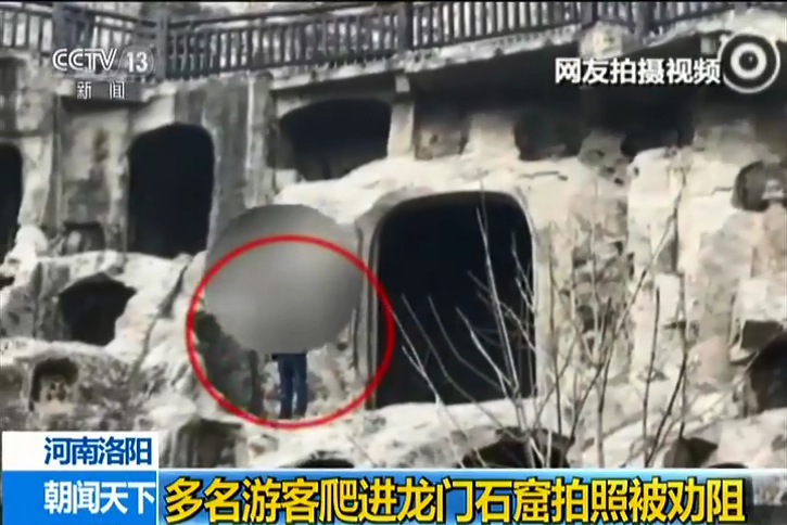 游客爬進龍門石窟拍照被勸阻