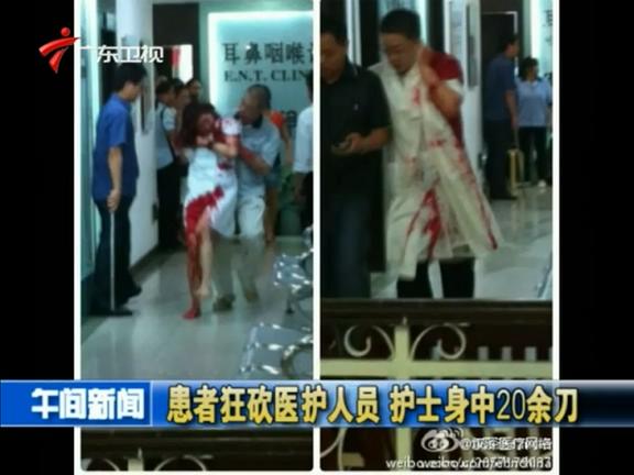 9月3日上午,一名43歲的男子在深圳鵬程醫院候診時突然拔出菜刀,將一名耳鼻喉科醫生砍傷后,再傷一名女導醫和一名保安,隨后挾持一名護士狂砍,護士身中20余刀。目前,4人均被送醫院治療,暫無生命危險。據了解,當事男子曾在該醫院找當事醫生看過鼻炎,因治療效果不明顯,懷恨在心,昨日攜帶4把刀到醫院報復,目前其已被警方刑事拘留。