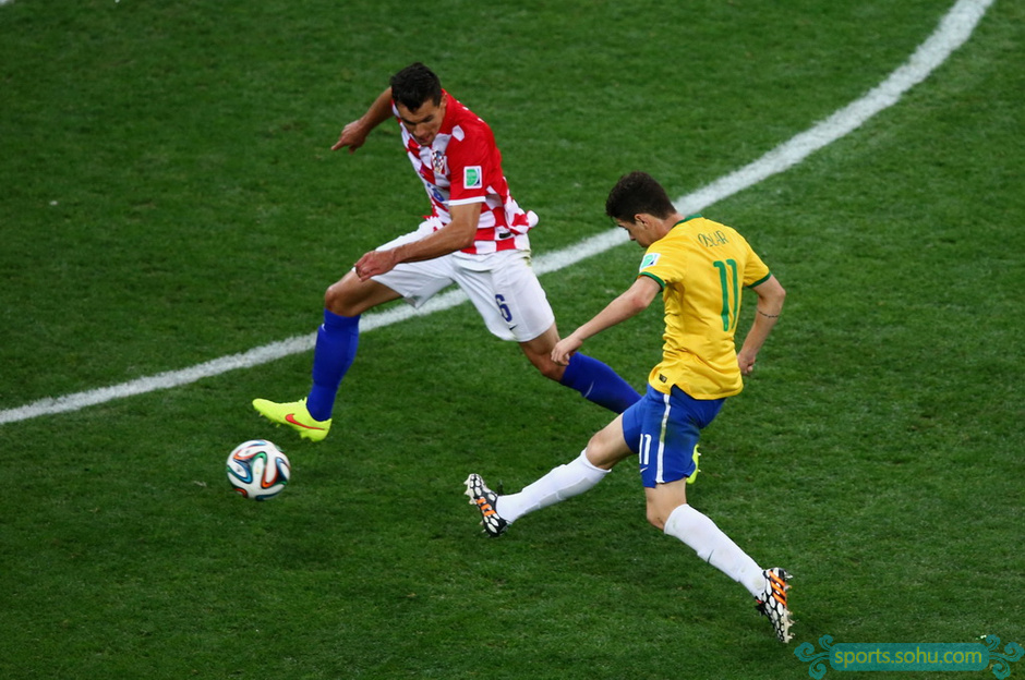 在巴西和克羅地亞的比賽最后時刻,拉米雷斯中場斷球,奧斯卡單騎闖關,在禁區邊緣一記捅射再次洞穿普萊蒂科薩的十指關,3-1,巴西鎖定勝局。最終,巴西隊憑借內馬爾的2個進球,3-1逆轉克羅地亞贏得本屆世界杯的開門紅。圖為奧斯卡捅射瞬間