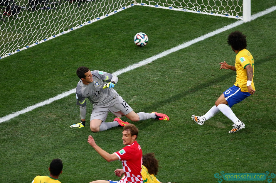 北京時間6月13日凌晨4時,2014年巴西世界杯揭幕戰在圣保羅競技場(科林蒂安競技場、伊塔蓋拉球場)展開,東道主巴西3-1逆轉東歐勁旅克羅地亞。第10分鐘,奧利奇左路傳中,馬塞洛不慎自擺烏龍。第29分鐘,內馬爾依靠個人能力扳平比分。第69分鐘,弗雷德制造爭議點球,內馬爾將球冷靜罰入,反超比分。第91分鐘,奧斯卡反擊中捅射再下一城。圖為馬塞洛烏龍進球瞬間。