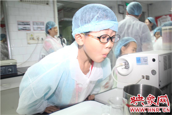 穿上白色的參觀(guān)服、戴上一次性帽子,受邀家庭進(jìn)入了檢測(cè)區(qū),參觀(guān)了質(zhì)量控制的檢測(cè)工作流程。正在工作的品控員,現(xiàn)場(chǎng)邀請(qǐng)了一名小朋友進(jìn)行了其中一項(xiàng)檢測(cè)--白利度檢測(cè)?!昂?jiǎn)單來(lái)講,就是利用密度儀,測(cè)試一瓶飲料的糖度和含氣量?jī)蓚€(gè)指標(biāo)。”品控員張青介紹道。
