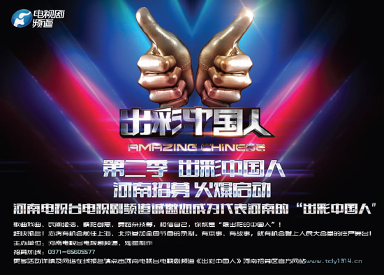 第二季《出彩中國人》河南招募火熱開啟,河南電視臺電視劇頻道誠邀您成為代表河南的“出彩中國人”。歌曲戲曲、民間絕活、精彩創(chuàng)意、舞蹈雜技等,相信自己,你就是“最出彩的中國人”!趕快報名,您將有機會前往上海、北京參加全國節(jié)目的錄制。有本事、有故事,就有機會登上人民大會堂的莊嚴(yán)舞臺!