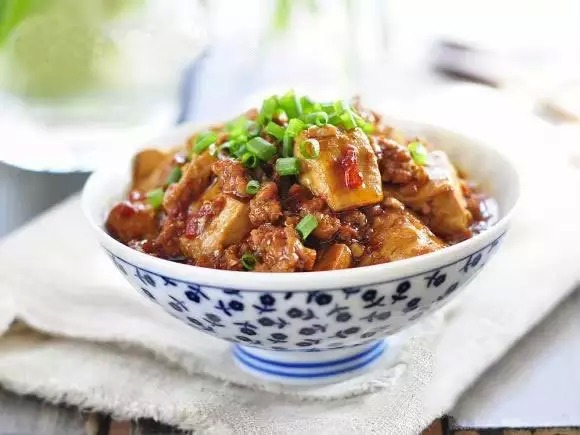3. 用半碗水兌開2湯匙的淀粉,勾芡,調(diào)入少許鹽,撒入少許蔥花,肉末和醬汁能包裹著豆腐即可。