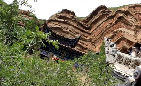 土樓觀依著山崖,是典型的丹峽地貌,在紫紅色砂礫巖上,廟宇殿堂醒目異常。