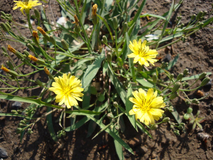 原生形態:抱莖苦荬菜多年生草本,高可達1米許。根粗壯而垂直。莖直立。根生葉排成蓮座狀,葉片長圓狀倒披針形,倒向羽裂狀或羽狀缺刻,先端短尖或鈍圓,基部慚狹成柄,花期通常不萎落;莖生葉基部抱莖。頭狀花序排成傘房狀;總苞圓摘狀,外層苞片極短小,內層苞片線狀披針形;花黃色,全部為舌狀花,先端5齒裂;花柱細長,柱頭2裂,冠毛白色,一層。瘦果紡錘形,稍扁,果喙長約為瘦果的1/4,通常與瘦果不同色。花期春季。生于山腳、路邊、疏林內、河邊。