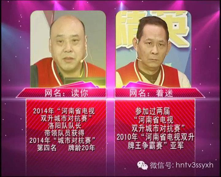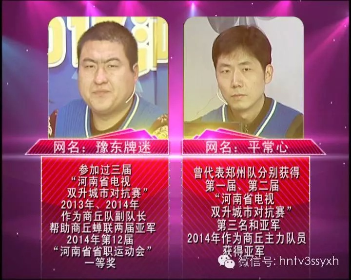 對陣選手來頭也是不小,戰績顯赫。豫東牌迷來自商丘,商丘隊副隊長,曾參加過三屆城市對抗賽,2013、2014年作為商丘隊主力隊員幫助商丘蟬聯兩屆亞軍,2014年第12界河南省省職運動會一等獎平常心曾代表鄭州隊獲得第一屆城市對抗賽第三名,第二屆城市對抗賽亞軍,2014年的作為商丘主力獲得亞軍