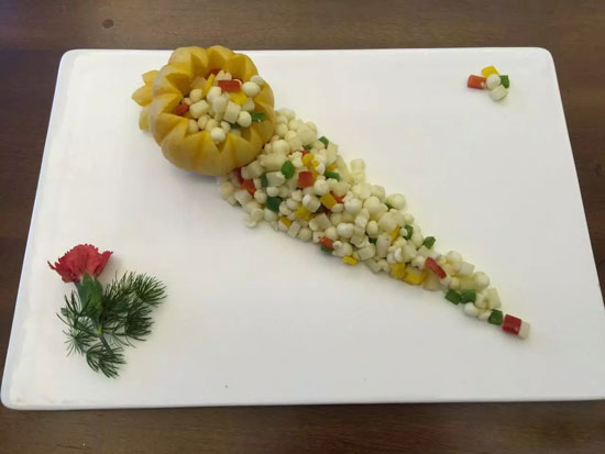 4.把山藥丁,芡實,青椒焯水,炒制,加入鹽,蘑菇粉,流水芡調味。裝入金瓜即可。