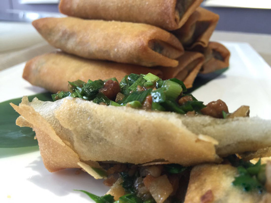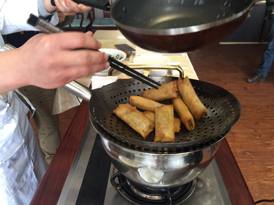 去皮五花肉剁成帶有顆粒感的肉餡,調好味道,炒熟、晾涼就可以用了。炒餡的時候師傅還用到了具有濃郁開封特色的調味料,肉餡炒好后韭菜的加入也是頗為講究的,最后像疊被子一樣將春卷包好,下鍋炸成金黃色就可以了!你看,這酥脆的外皮很誘人對不對!