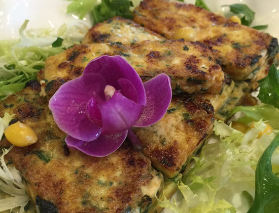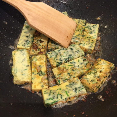 六、煎野菜豆腐。鍋中加入少許油,熱鍋涼油放入豆腐,小火煎制。只要豆腐開始起皮,即可放入少許生抽調味,再放入蔥姜末炒香。