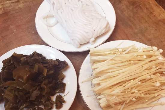 原料:雞脯肉、酸菜、土豆粉、泡椒、大蒜片、花椒。