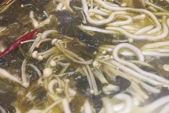 3.鍋中加入少許油,爆香蒜片、泡椒,加入料酒,隨后放入酸菜,超出酸菜的香味,然后加入開水,再放入金針菇和土豆粉,加入鹽、胡椒粉、料酒調味,中火慢慢煮,成熟撈出用來裝盆墊底。